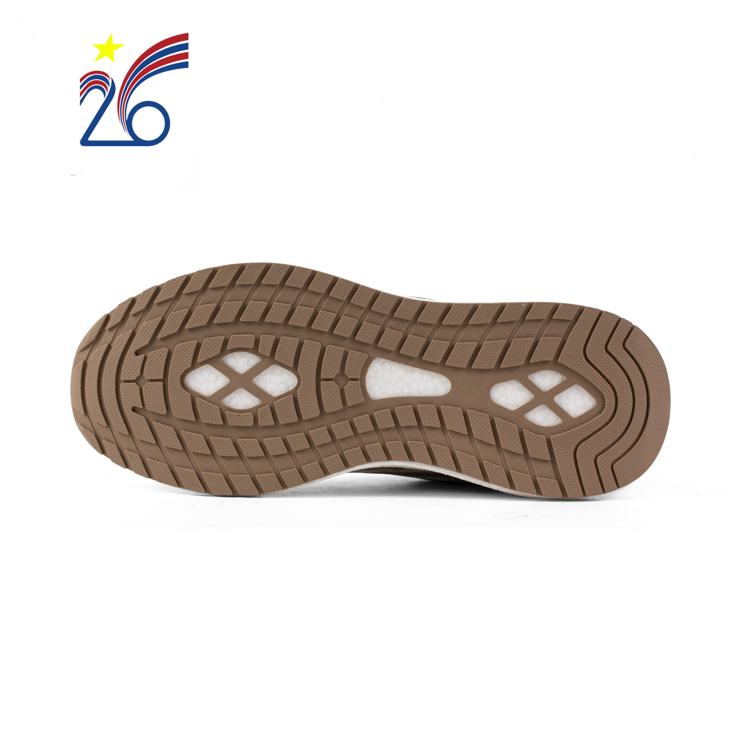 Đế giày 2 lớp, 1 lớp eva và lớp ngoài cao su, lôgo và trang trí ép nổi.